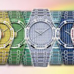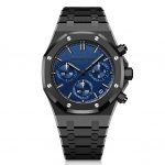 Measuring 41mm in diameter and 10.7mm in thickness, the cheap replica Audemars Piguet‘s case is composed of a combination of white gold bezel/horns/caseback and a cobalt blue ceramic case middle. It is topped with a double curved crystal, domed on the inner surface and concave on the outer. Beneath the sapphire crystal is a whole world of blue-tinted ALD or CVD, such as the flange with a thin white minute track, the bridges and the movement’s plate, with a few silver (the barrel and the gear train) and gold (the balance and the central baton-type hour and minute hands) touches.