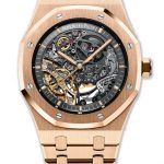 Protected by a domed doubled-curved sapphire crystal that rises above the bright polished white gold bezel, the dial reveals the openworked tourbillon movement. Swiss made replica Audemars Piguet’s in-house calibre 2948, a multi-tiered hand-wound tourbillon movement, is framed by a dark grey lacquered inner bezel with white minute markings. The vertically aligned movement, with the tourbillon at 6 and the barrel at 12 o’clock, brings a pleasing symmetry to the skeletonization. The gracefully curved bridges of the movement are picked out in three different shades of grey, accentuating the depth and providing a defined contrast to the light grey barrel and gear train. Moreover, the mainplate and bridges, visible on both sides of the best quality replica watches, are decorated with vertical satin-brushing, while the barrel and wheels display a circular satin-brush finishing. Interrupting the grey colour scheme of the bridges, the pink gold-tone balance wheel of the tourbillon, the 18k pink gold hands and the jewels on the tourbillon and barrel bridges provide a touch of warmth.